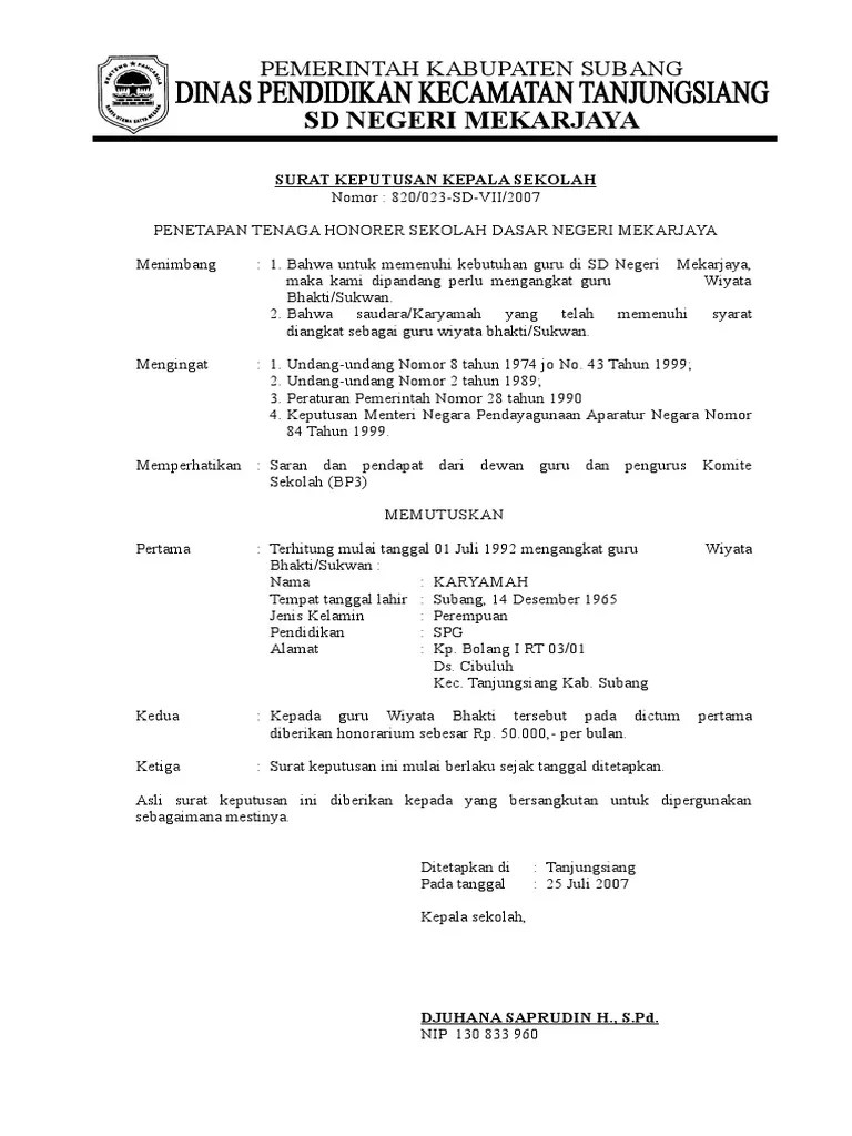 Kepala sekolah dasar negeri kosambi dalam i. Surat keputusan atau sk adalah sebuah surat pernyataan yang di keluarkan oleh lembaga yang. Selain menjadi pelengkap data sekolah, contoh sk guru honorer . Pengangkatan guru tidak tetap (honorer). Penetapan dan pengangkatan guru sukwan.